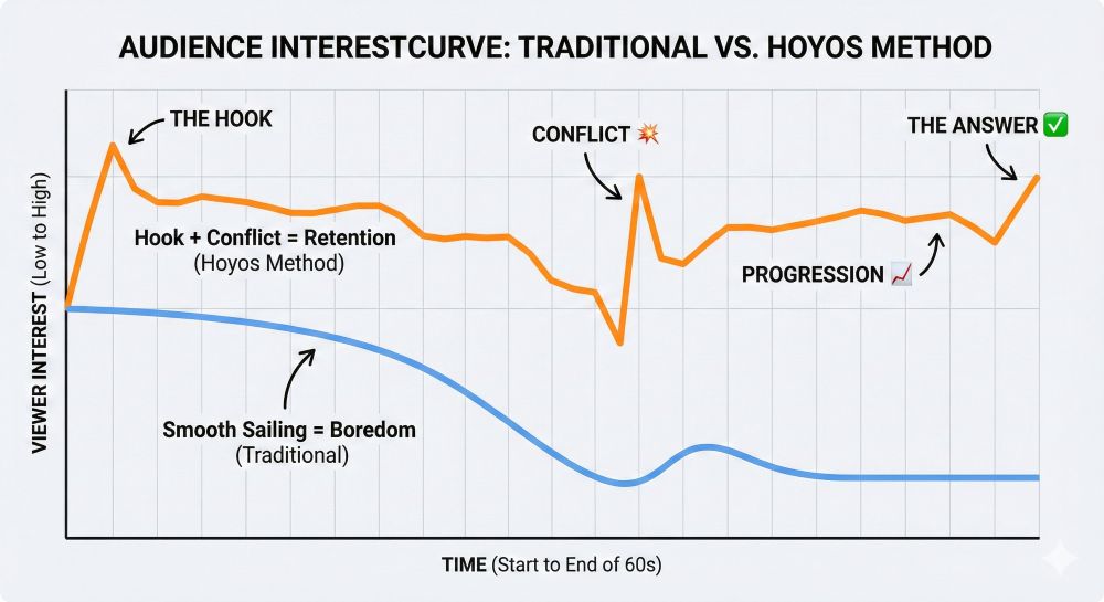 Hoyos’s talk is not just about “being funny” on camera; it is a masterclass in Narrative Efficiency. She dismantles the traditional storytelling arc (often known as Freytag’s Pyramid) and recompresses it for the modern brain.
